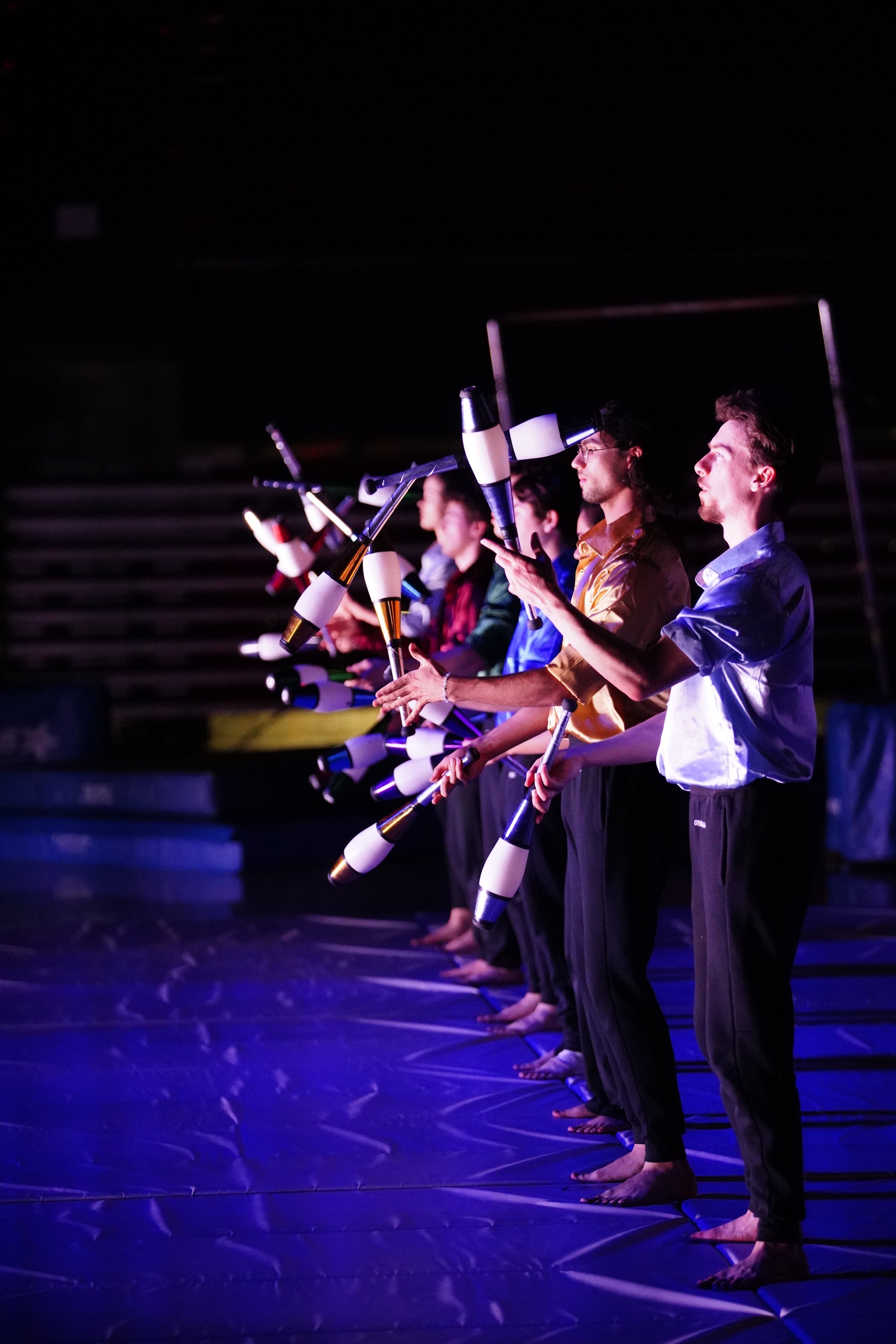 Juggling made its Gymkana debut during the 1952 Home Show with an act known as the morticians, performed by Eric Winter and Byron Milligan. One of Gymkana’s many acts that makes resurgences within the repertoire throughout the years, Gymkana’s jugglers have been known to show off their skills with balls, clubs, scarves, hoops, knives, and even fire. The act is often presented with a theme or a comedic skit, and troupers have utilized balancing poses, stacks of chairs, a unicycle, and even skateboards to make this act an impressive showcase of coordination, concentration, and teamwork.